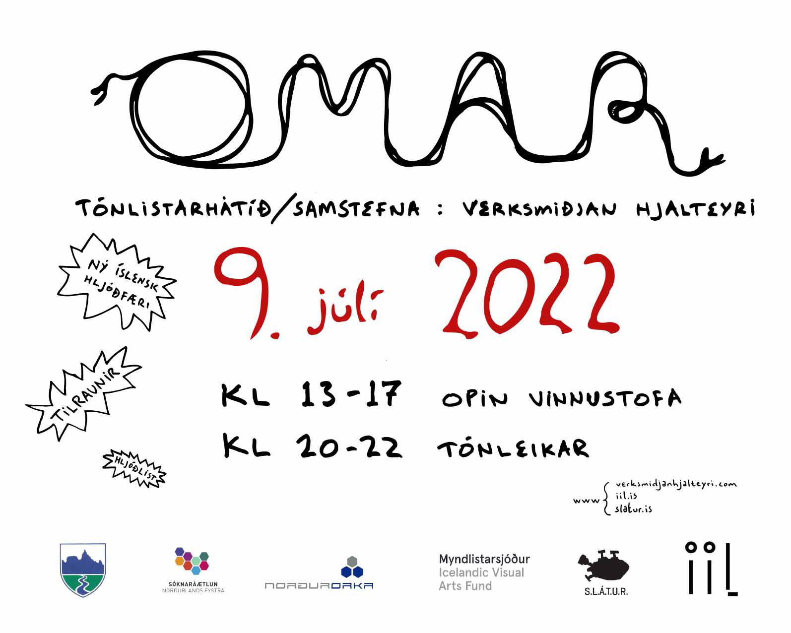 Tónlistarhátíðin ÓMAR var haldin laugardaginn 9.júlí í Verksmiðjunni á Hjalteyri. Ýmis nýsmíðuð hljóðfæri voru kynnt á opinni vinnustofu þ.á.m. Dórófónn Halldórs Úlfarsonar sem lék stórt hlutverk í óskarsverðlaunatónlist Hildar Guðnadóttur. Rafræn langspil og tölvuhljóðfæri voru kynnt og gestir hvattir til að taka þátt, prófa og jafnvel koma með eigin hljóðgjafa, nýsmíðuð hljóðfæri eða hljóðtilraunir. Tónleikar þar sem flutt var tónlist þátttakenda og afrakstur vinnustofunnar.