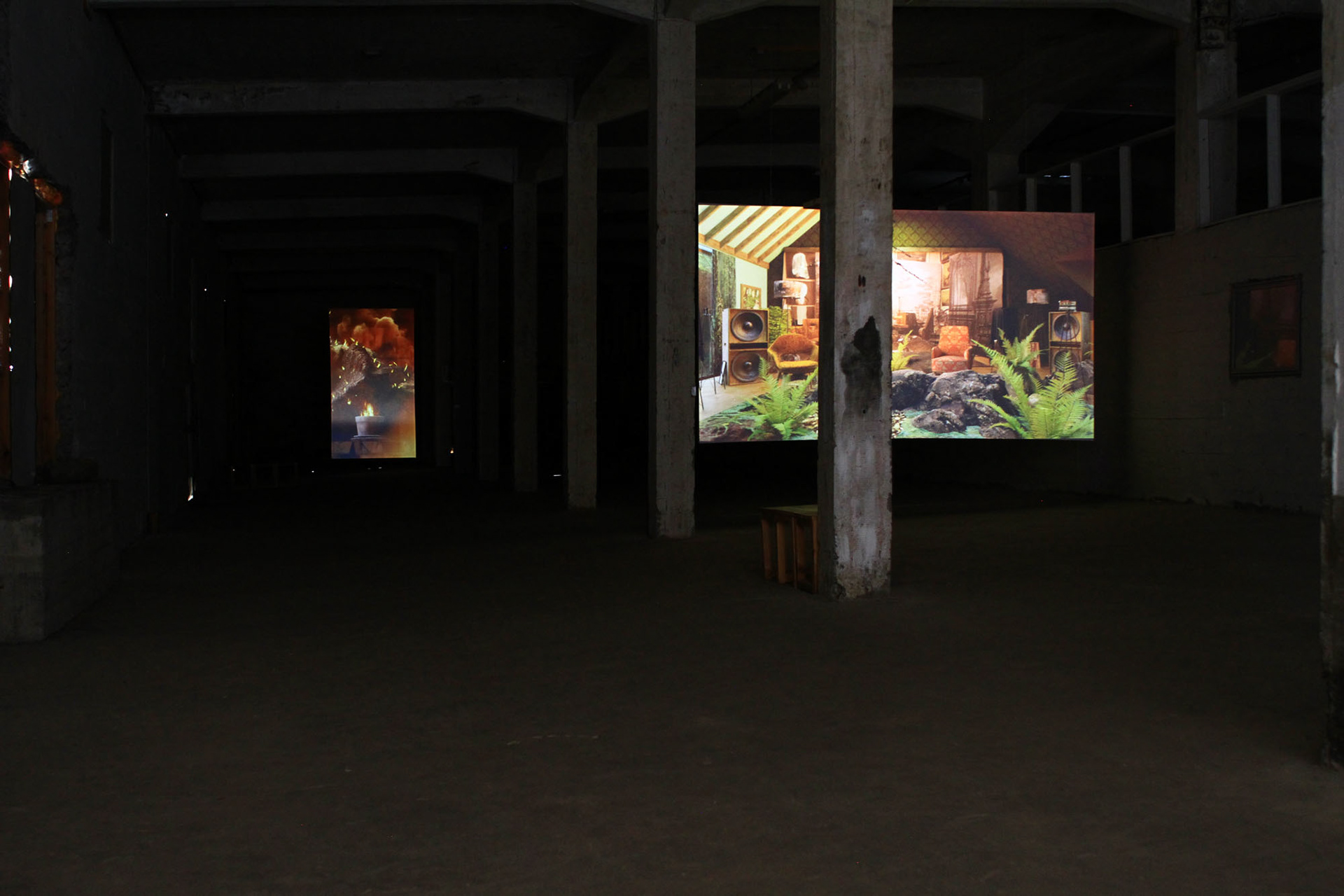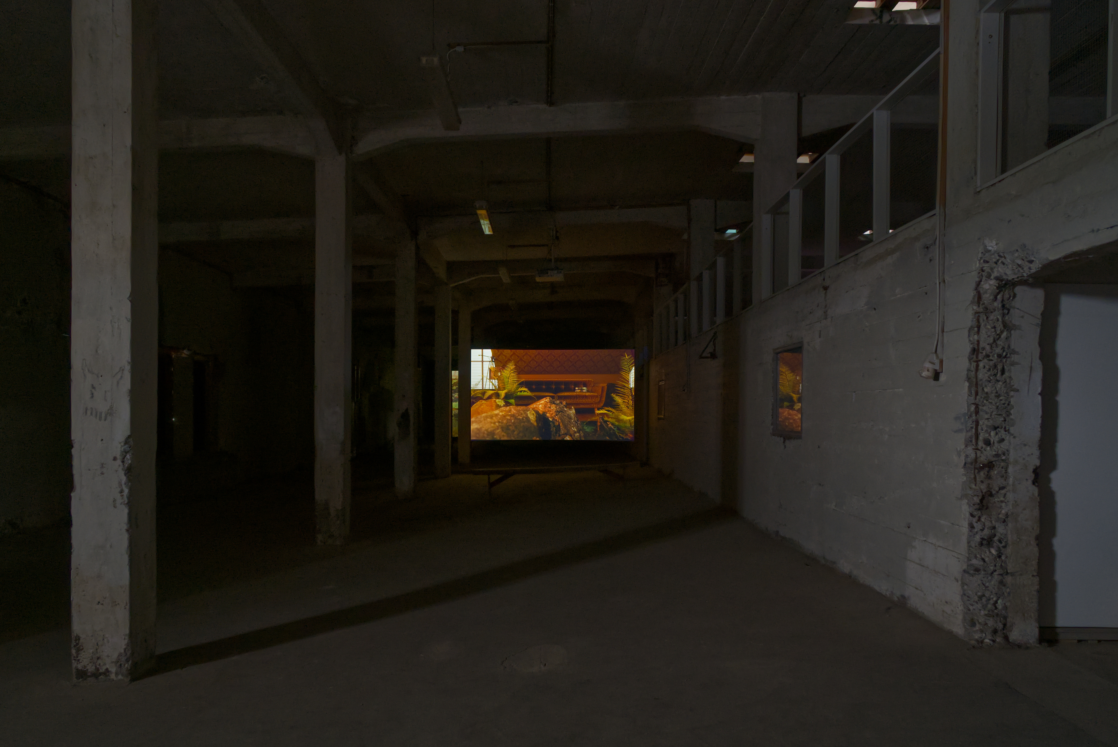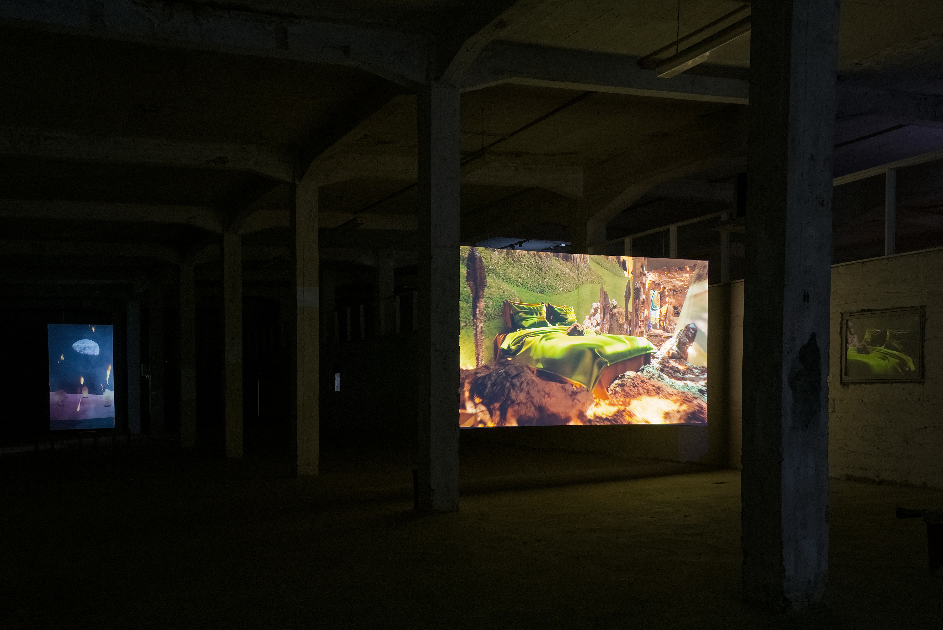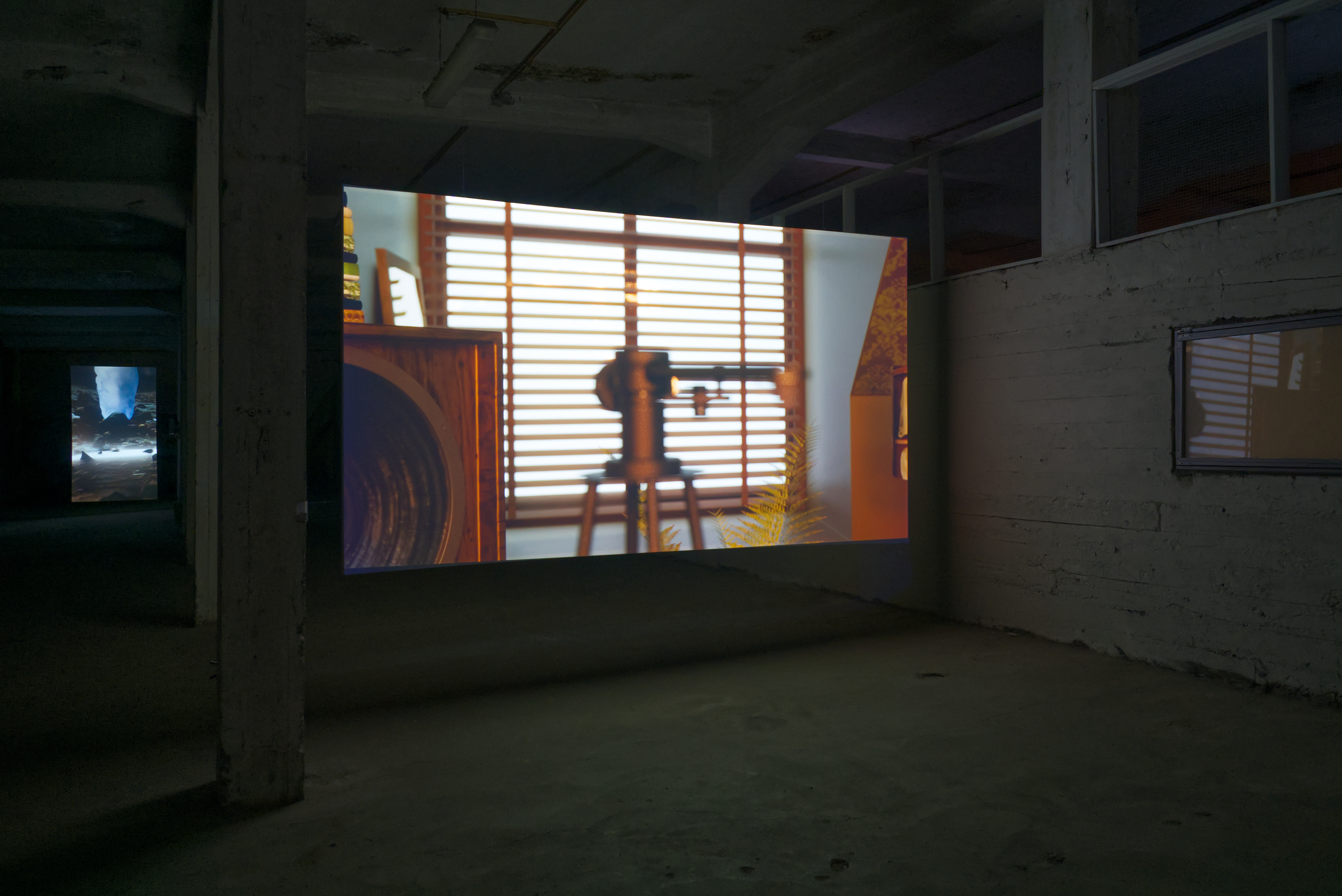 In this exhibition at Factory, featuring works by Julie Tremble and the duo Philippe-Aubert Gauthier and Tanya St-Pierre, an intentful environment of cinematic realism, created from a corpus of entirely digitally generated or manipulated images, rubs shoulders with the Icelandic landscape’s bucolic grandeur and the site’s imposing architecture. In an unsettling dialogue between reality and digital fantasy, Julie Tremble's realer-than-life images juxtapose the magnificent views framed by the building's openings, while Gauthier and St-Pierre's meticulously fabulated domestic spaces endeavor to embed themselves within the industrial history and ruggedness of the same site. In this reciprocal interplay of influence, the porosity of images, places, and the materiality of what we see sets the gaze in a kind of vertical time, where the accumulation of temporalities acts on our perception of the world and its representations. Such perception is also shaped and sometimes distorted by a noteworthy presence of sound.