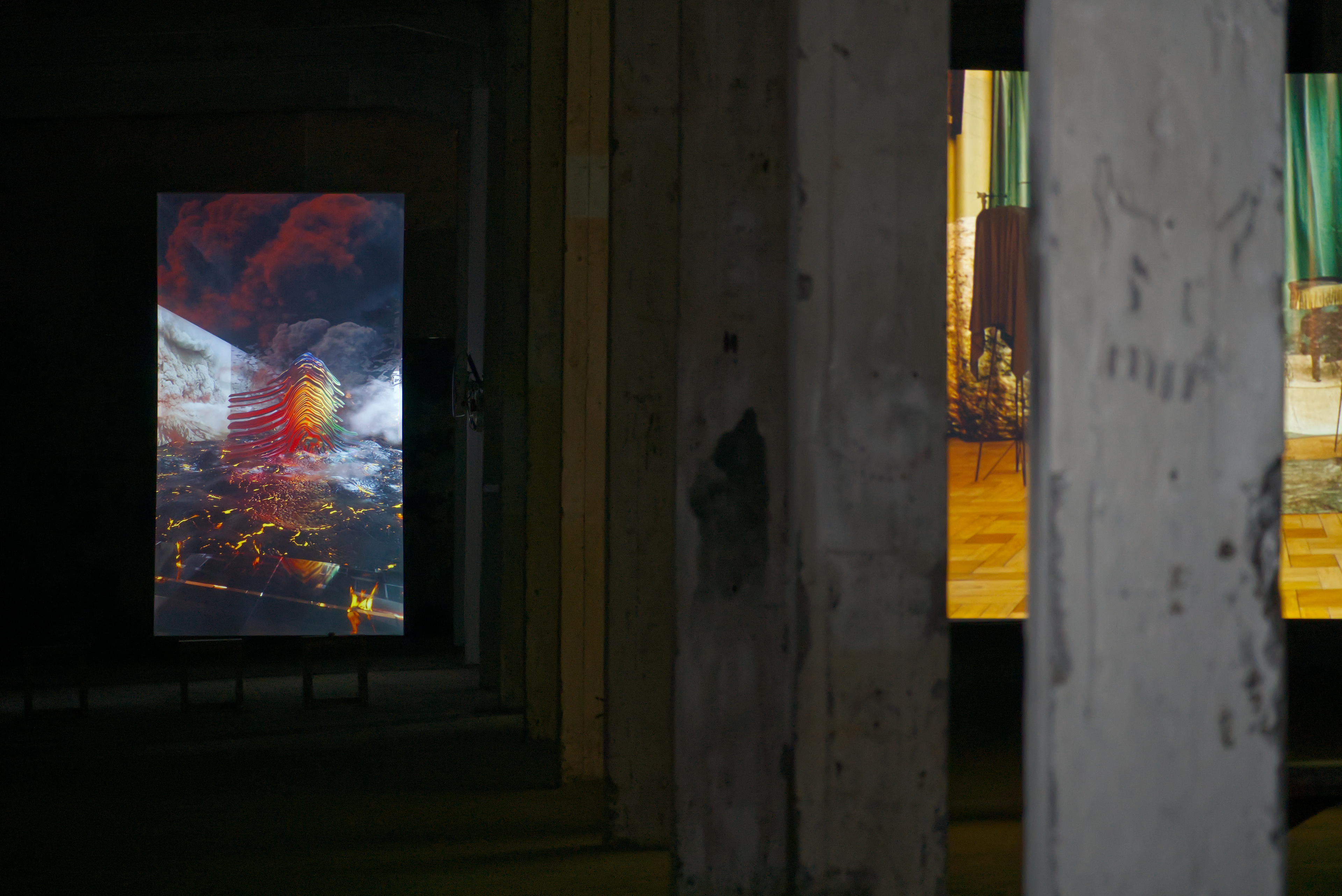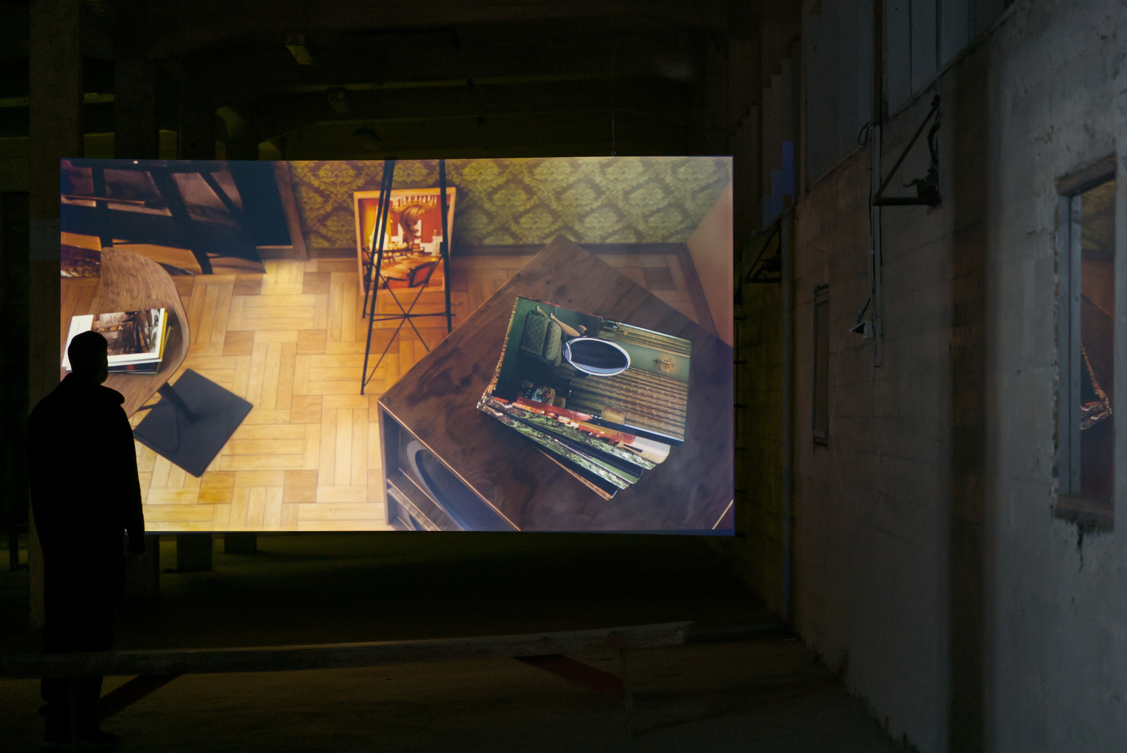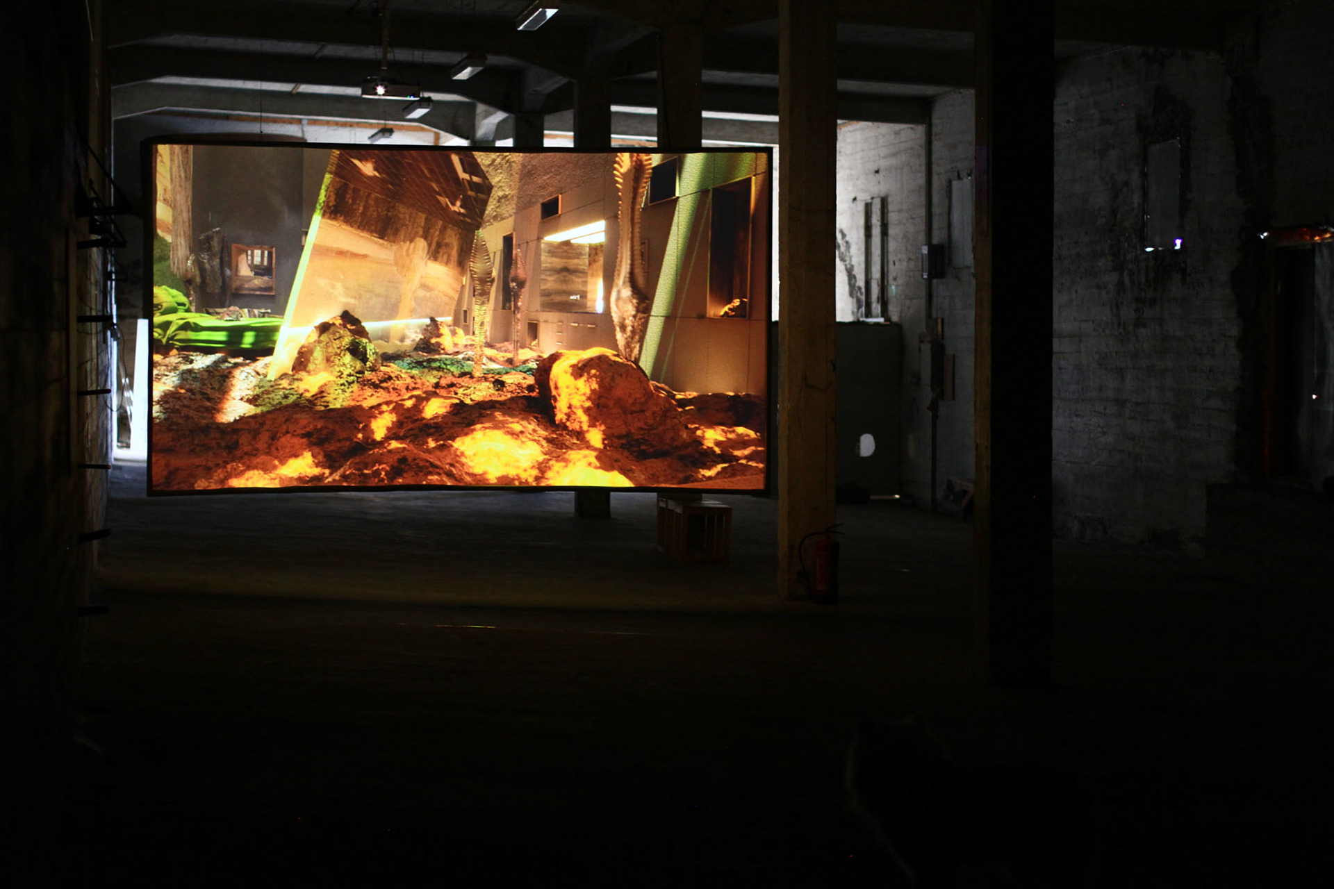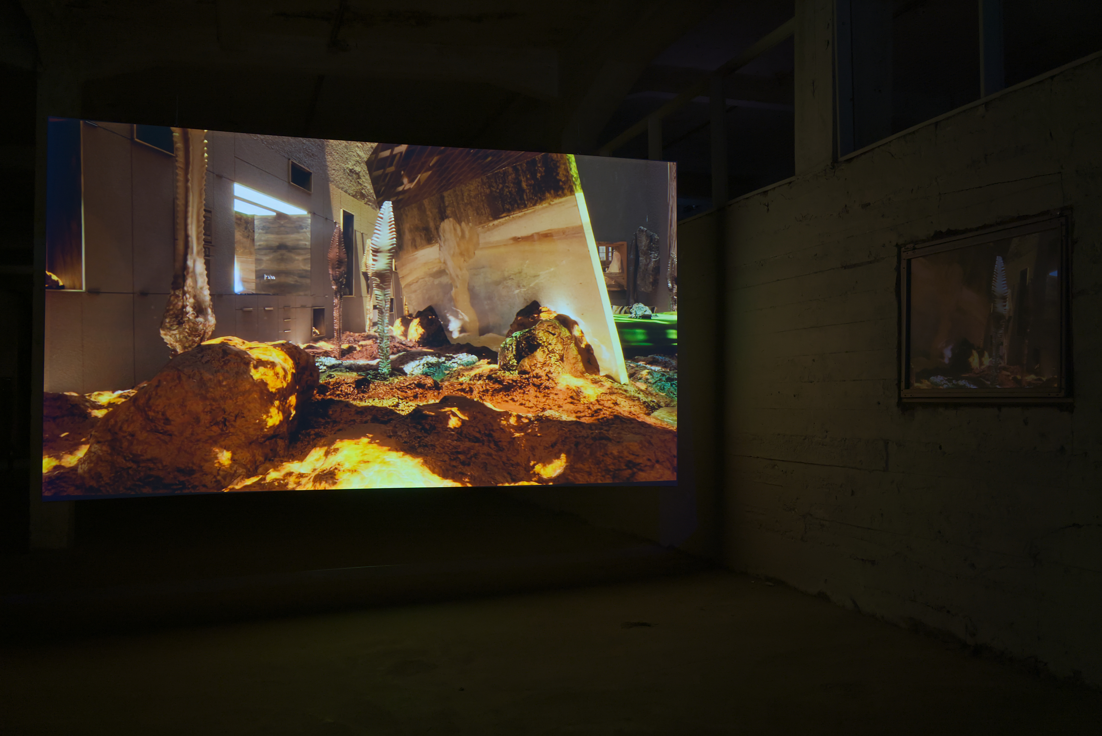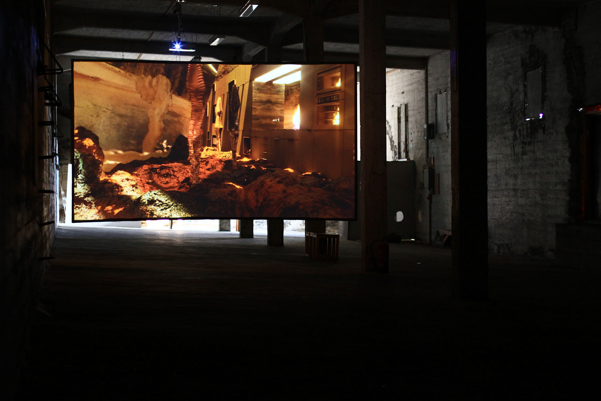 In this exhibition at Factory, featuring works by Julie Tremble and the duo Philippe-Aubert Gauthier and Tanya St-Pierre, an intentful environment of cinematic realism, created from a corpus of entirely digitally generated or manipulated images, rubs shoulders with the Icelandic landscape’s bucolic grandeur and the site’s imposing architecture. In an unsettling dialogue between reality and digital fantasy, Julie Tremble's realer-than-life images juxtapose the magnificent views framed by the building's openings, while Gauthier and St-Pierre's meticulously fabulated domestic spaces endeavor to embed themselves within the industrial history and ruggedness of the same site. In this reciprocal interplay of influence, the porosity of images, places, and the materiality of what we see sets the gaze in a kind of vertical time, where the accumulation of temporalities acts on our perception of the world and its representations. Such perception is also shaped and sometimes distorted by a noteworthy presence of sound.