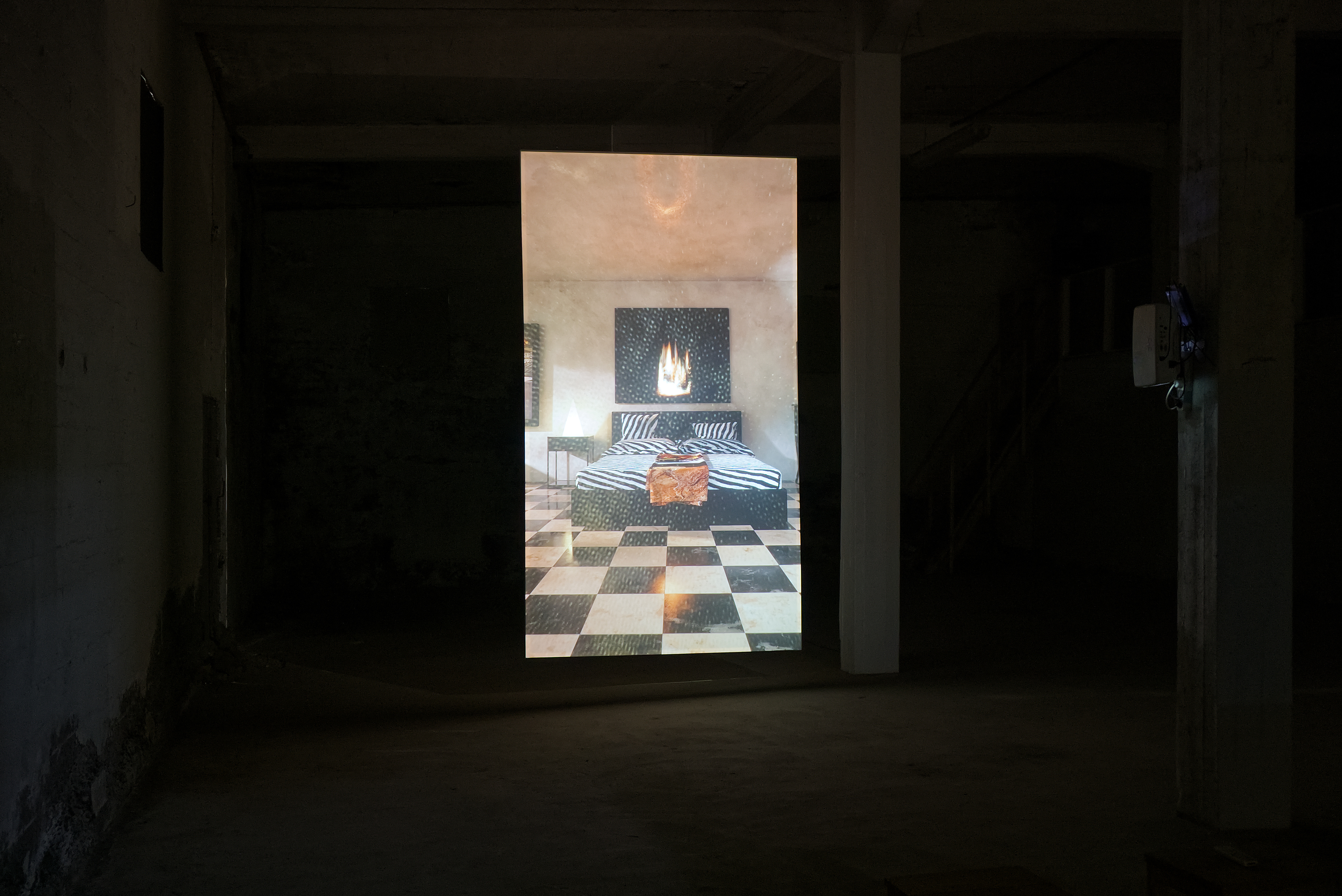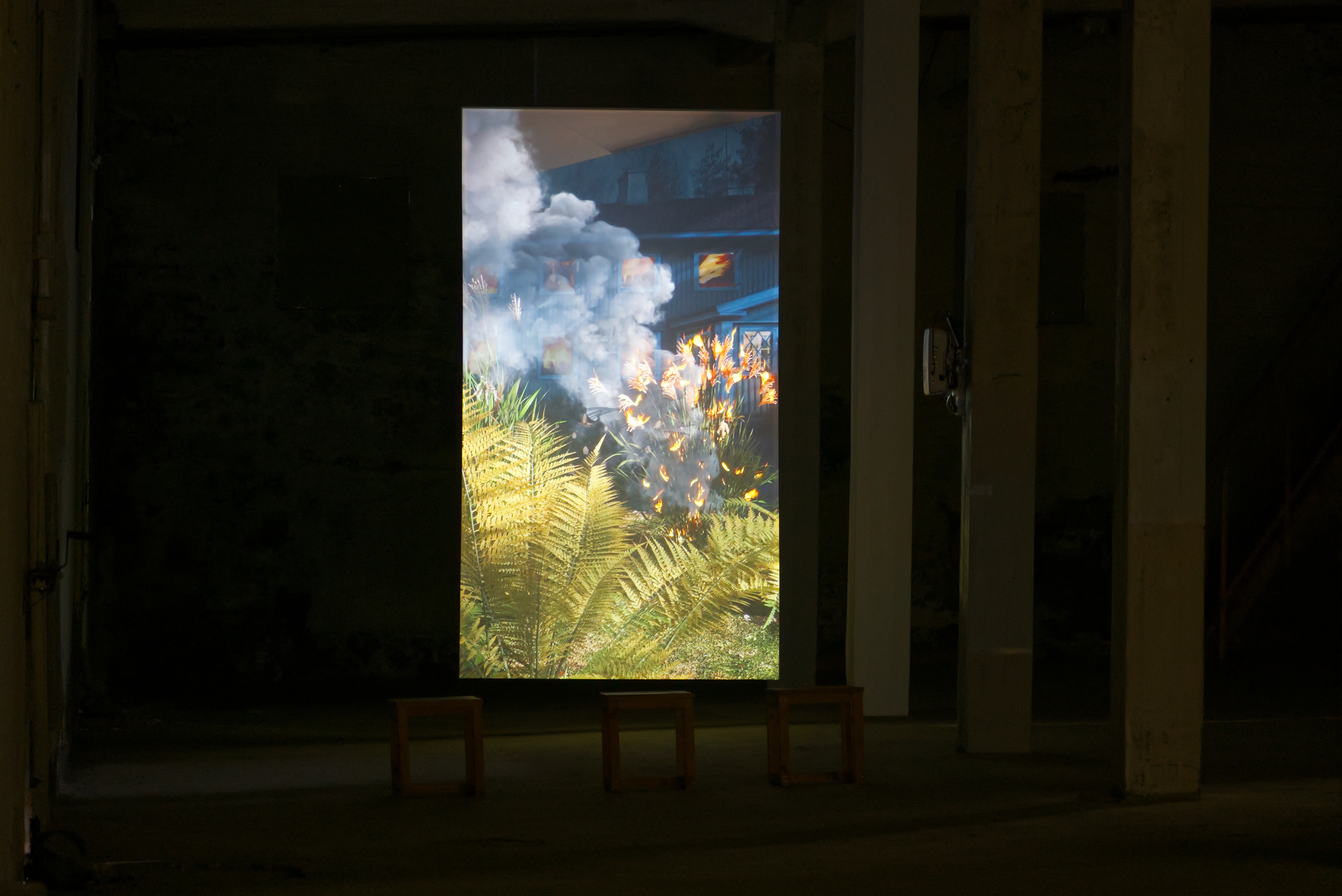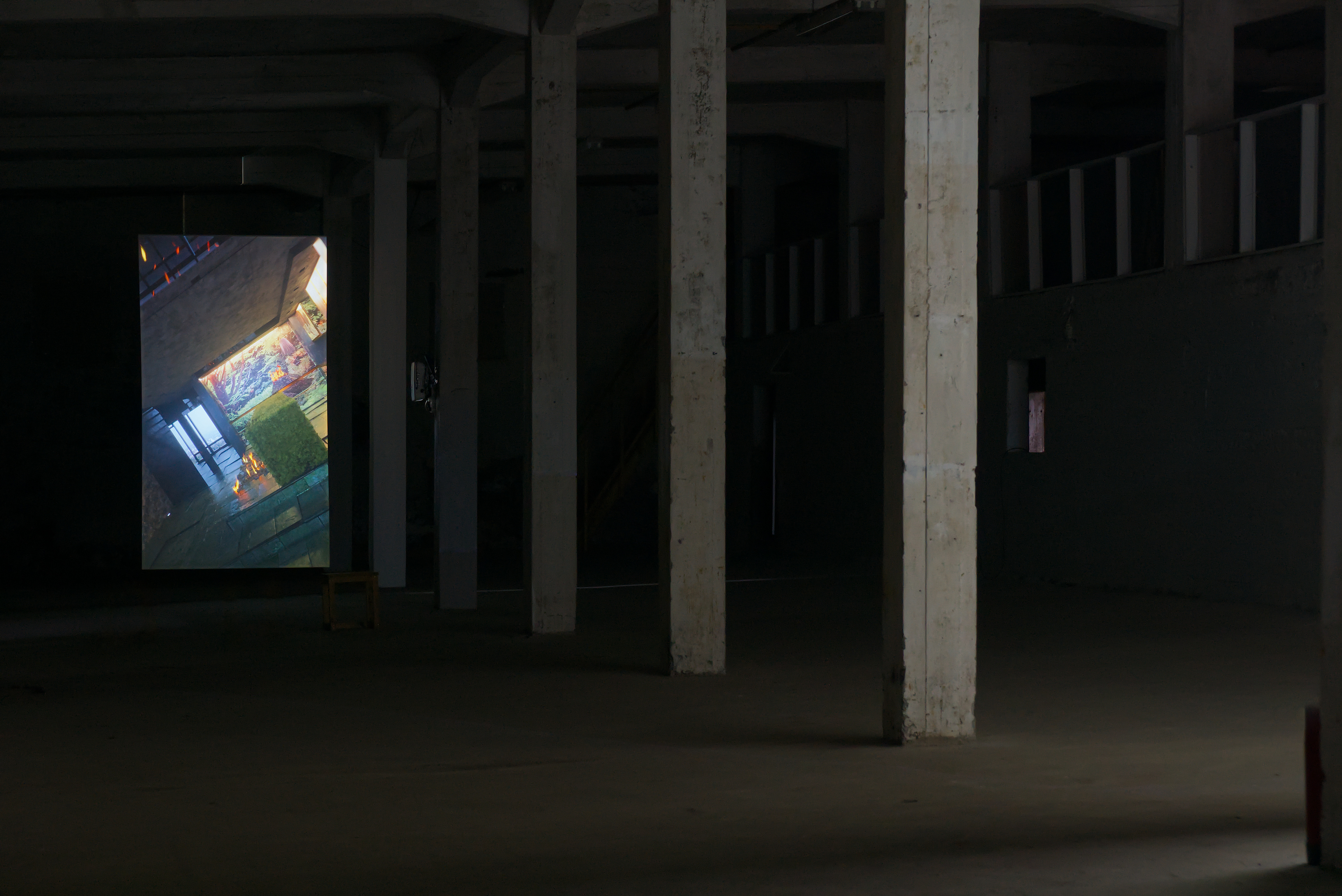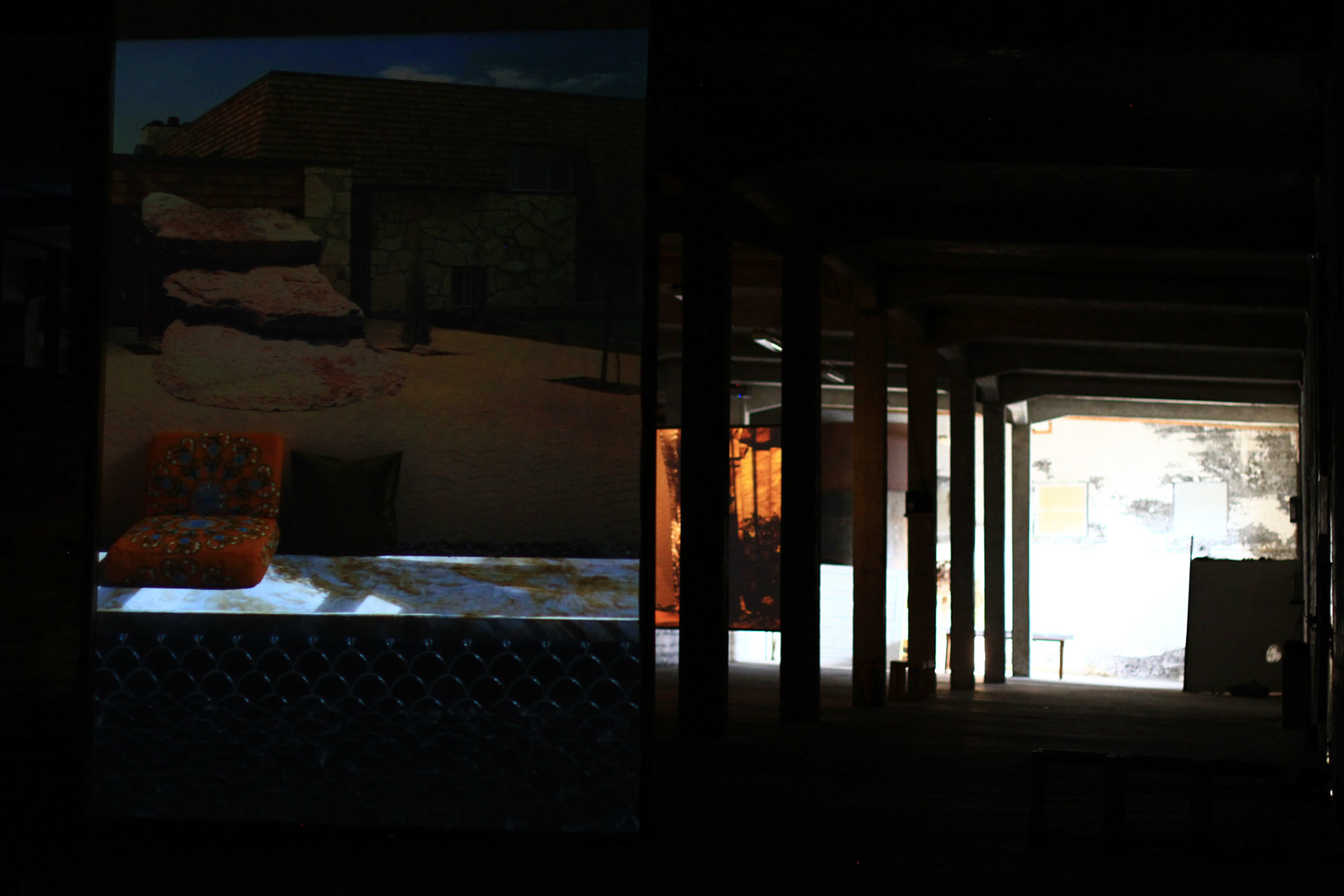 In this exhibition at Factory, featuring works by Julie Tremble and the duo Philippe-Aubert Gauthier and Tanya St-Pierre, an intentful environment of cinematic realism, created from a corpus of entirely digitally generated or manipulated images, rubs shoulders with the Icelandic landscape’s bucolic grandeur and the site’s imposing architecture. In an unsettling dialogue between reality and digital fantasy, Julie Tremble's realer-than-life images juxtapose the magnificent views framed by the building's openings, while Gauthier and St-Pierre's meticulously fabulated domestic spaces endeavor to embed themselves within the industrial history and ruggedness of the same site. In this reciprocal interplay of influence, the porosity of images, places, and the materiality of what we see sets the gaze in a kind of vertical time, where the accumulation of temporalities acts on our perception of the world and its representations. Such perception is also shaped and sometimes distorted by a noteworthy presence of sound.