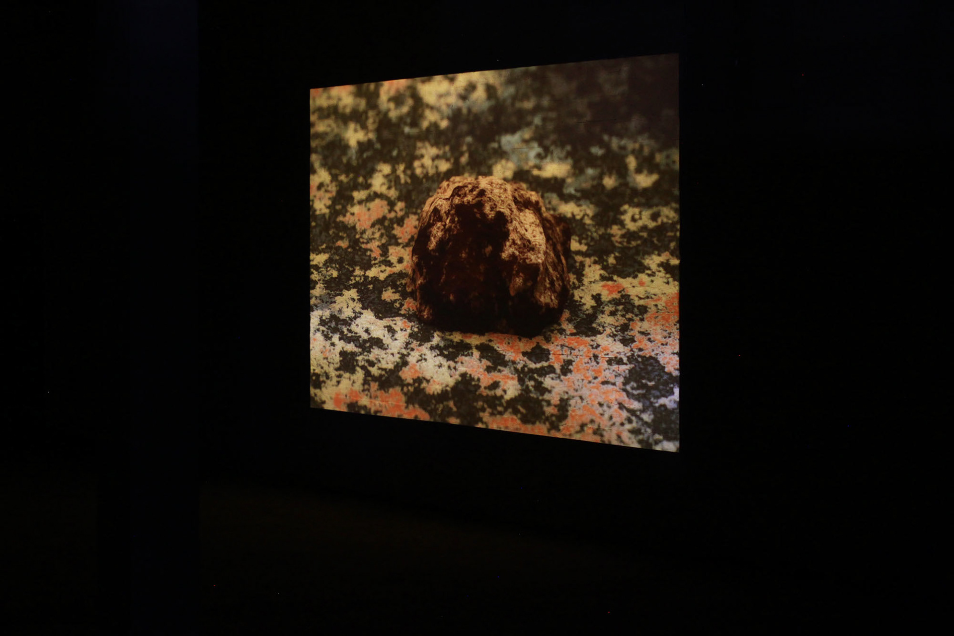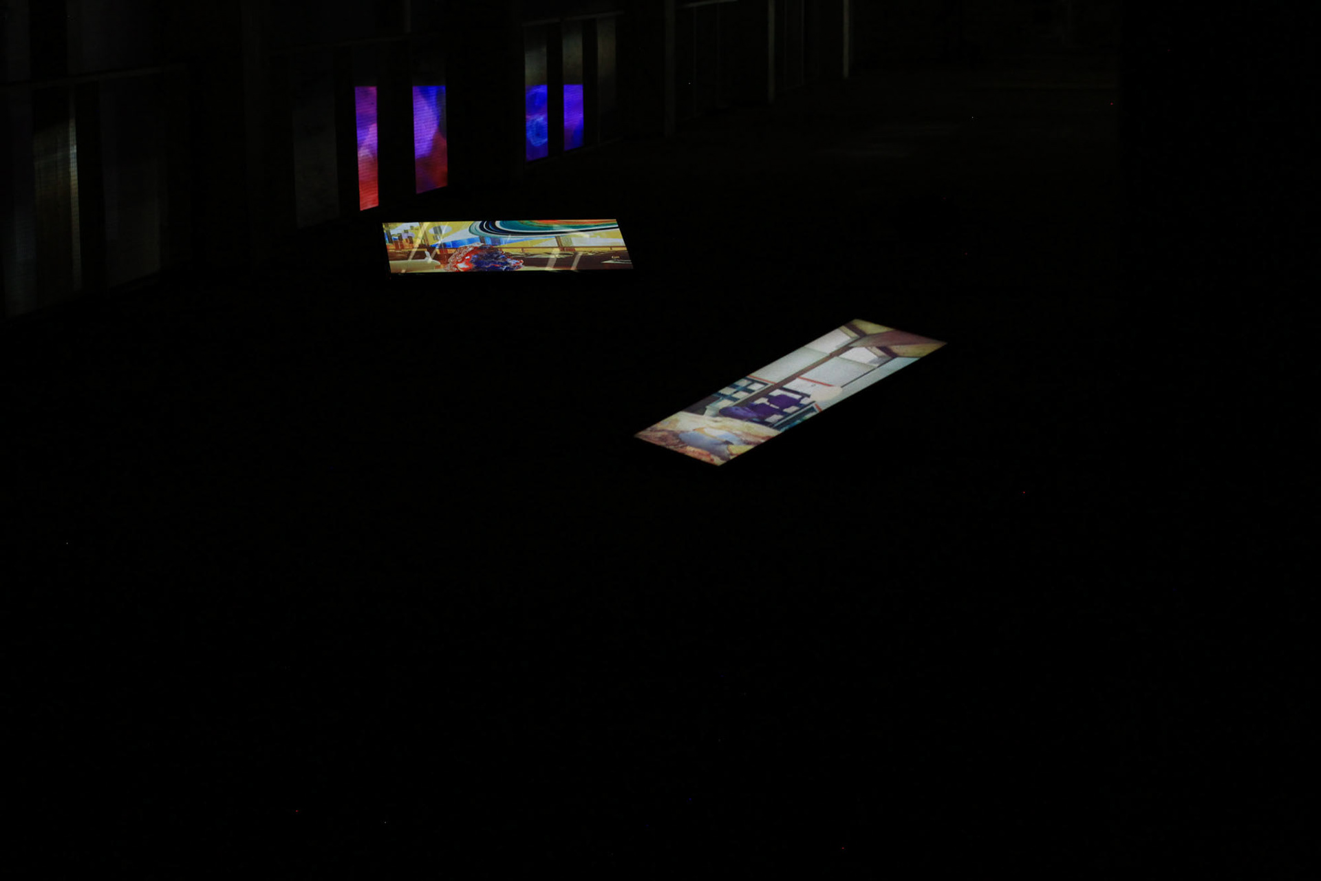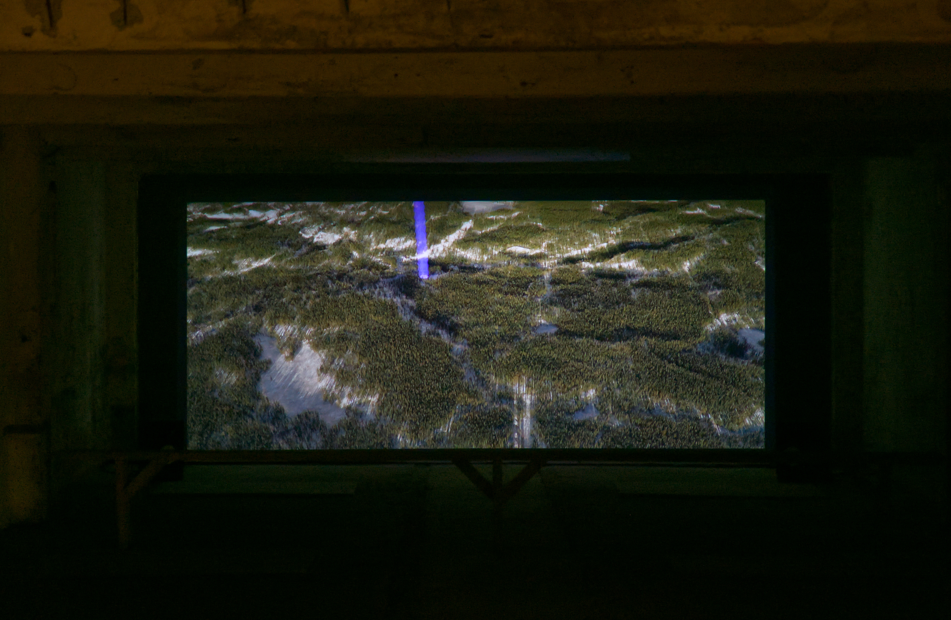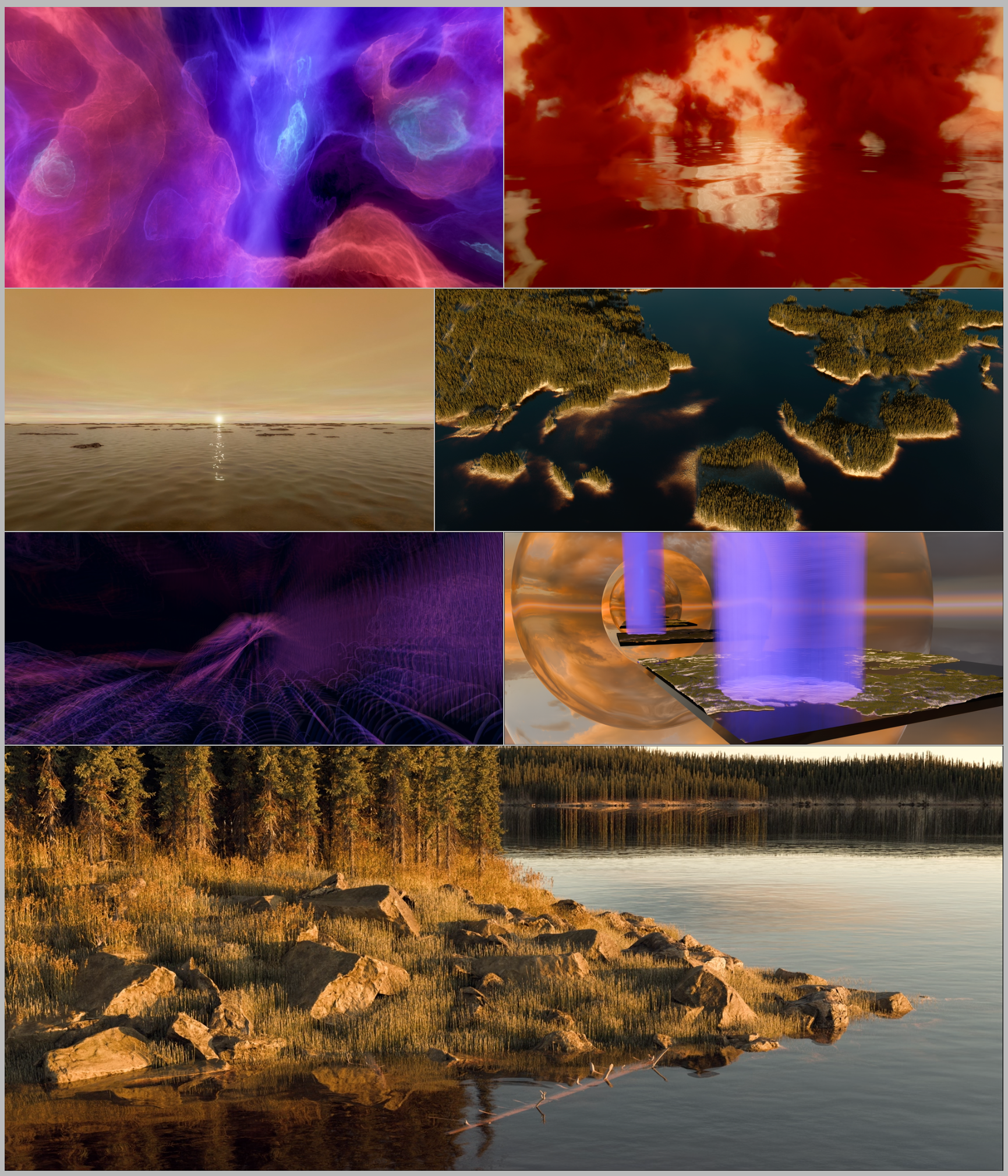 The Ultraviolet Catastrophe, for its part, responds to the virtual character of matter. Across three tableaux, majestic natural landscapes inspired by Northern Quebec’s wilderness are rendered with reverential photorealism. Observing the macro and the micro, the viewpoint voyages across hundreds of kilometres before a flickering disturbance pulls the image apart, diverging into an otherworldly landscape. Whether such a collapse is photonic or one of consciousness, those smallest elements – molecules, spectra – seen only through the lens of a microscope are made to appear radiating with absolute grandeur. In response to such happenstance encounters, the work's soundtrack, by composer and sound ecologist Rehab Hazgui, transposes quantum randomness onto the chance of sound.
