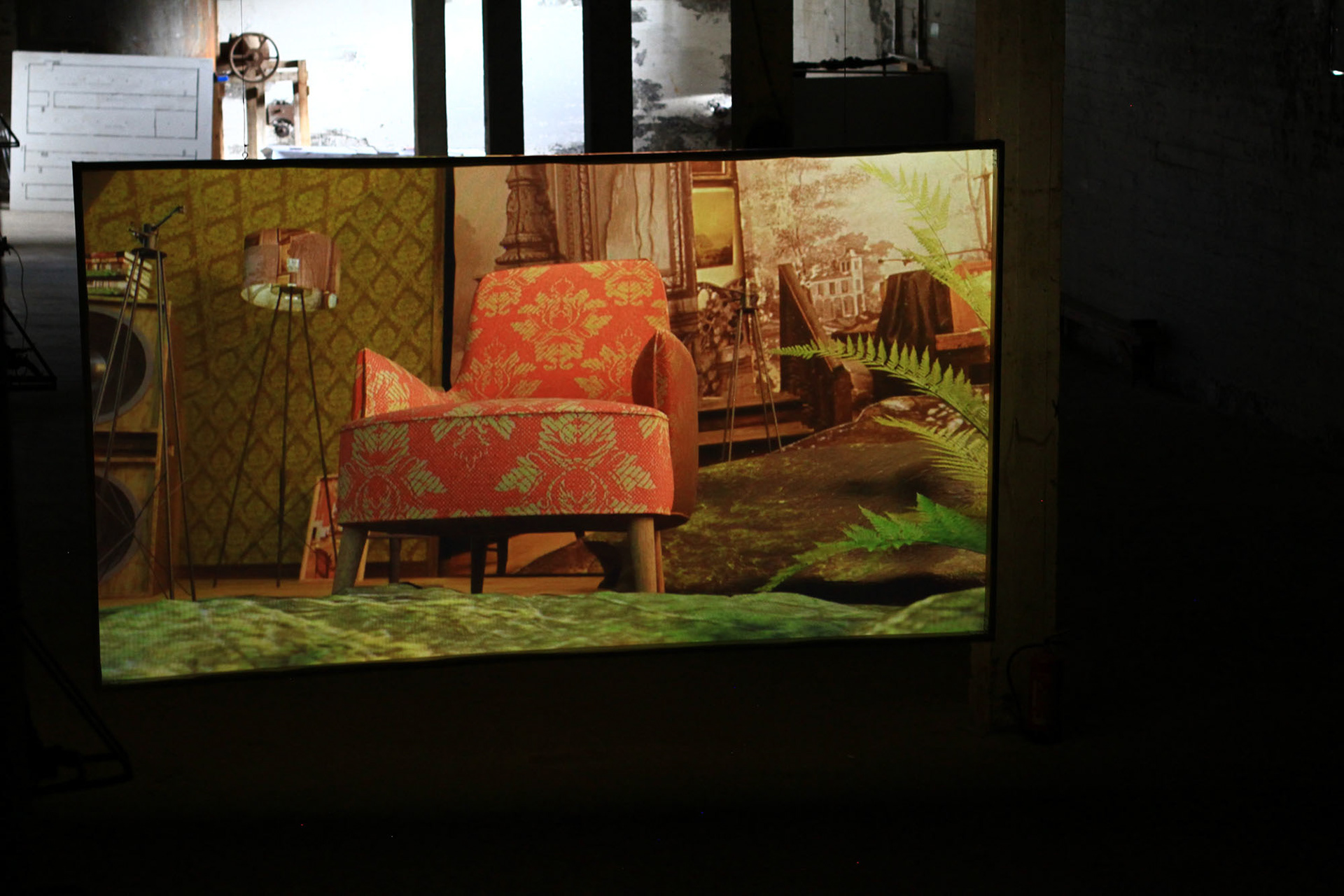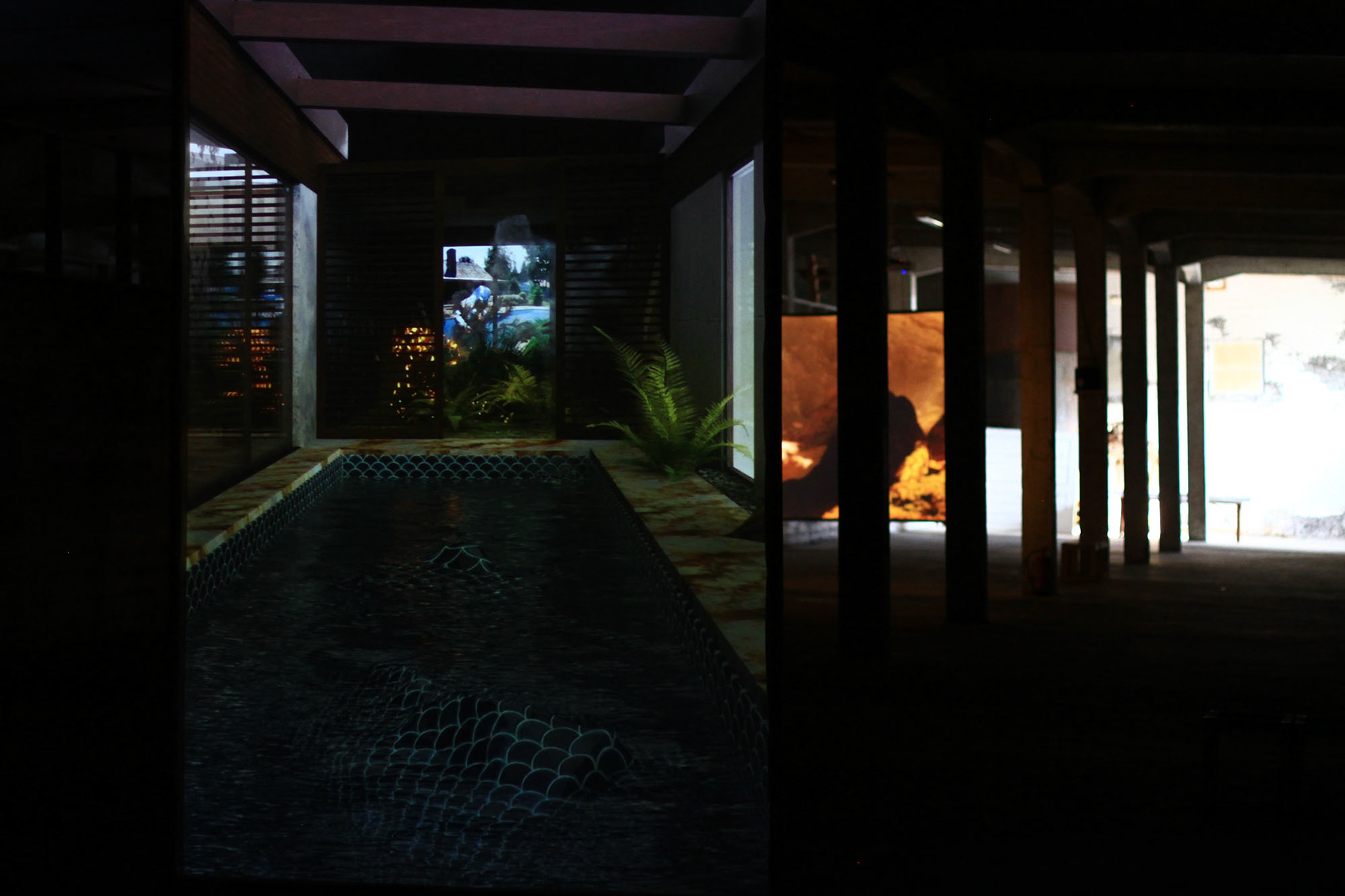 Dans un état hypnagogique — L'installation and Dans une sorte de rêve éveillé — L’invitation, by Philippe-Aubert Gauthier and Tanya St-Pierre, contemplate the desire and drive to domesticate nature. In an almost fantasized reading of the humanoid tendency to swallow what is wild, the artists question processes of consumption and representation. Taking as its source material an impressive series of collages by St-Pierre made from interior design magazines from the 70s and 80s, the two works, while dealing with radically different architectural environments – one within the framework of the luxury condo, the other the archetypal swanky bungalow – offer a kind of delirious visual archaeology in the form of multi-channel digital animations. The tearing, cutting, extraction, and assemblage inherent to such methodologies – manual or technological – multiply in meaning when applied to concepts of nature. Simultaneously brought to emphasis is an ideal to protect, a motif of comfort, and a menace, an indomitable uprising of lifeforms and inevitable invasion of that which is exterior to our interiors.