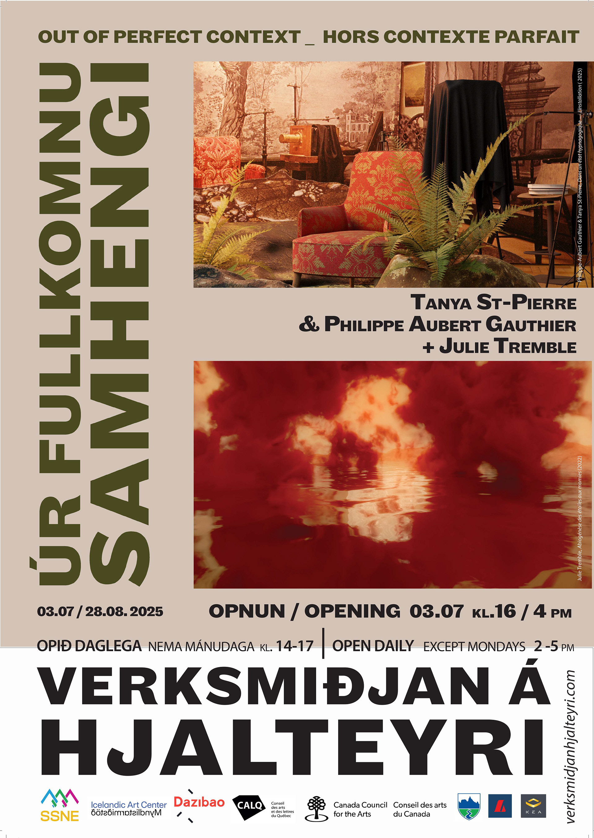 An initiative developed in collaboration between Dazibao (Montréal, Canada) and Factory (Hjalteyri, Iceland), Out of Perfect Context plays upon apparent incompatibilities and accentuated decontextualization to explore new forms of collaboration and exhibition-making. Starting from our relationship with nature and the role it plays in culture, the project proposes a meeting between urbanism and wide-open landscapes, image-making practices drawn from reality and others created entirely digitally, as well as an intersection, a confrontation even, between a fragile, endangered nature and an idealized, magnified nature. Two exhibitions will be presented, one at Dazibao, featuring works by Gústav Geir Bollason and Thorbjörg Jónsdóttir, and the other at Factory, featuring works by Julie Tremble and the duo Philippe-Aubert Gauthier and Tanya St-Pierre.