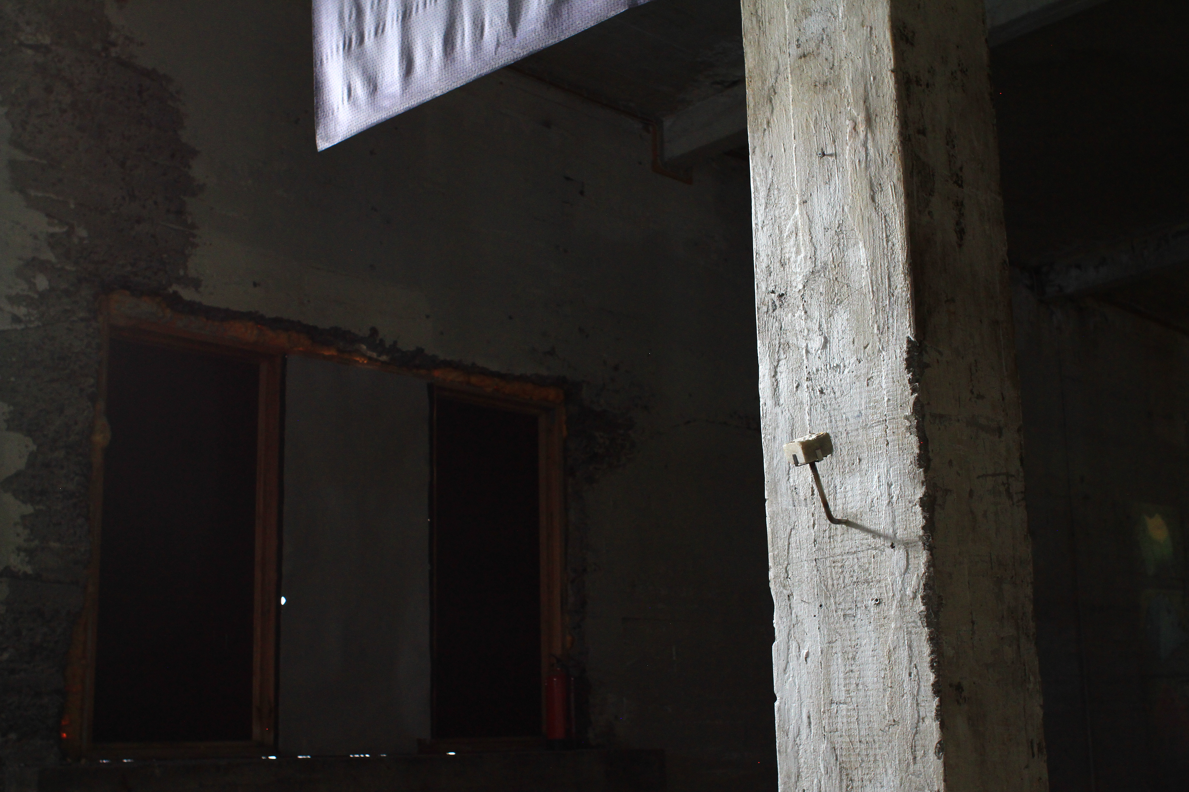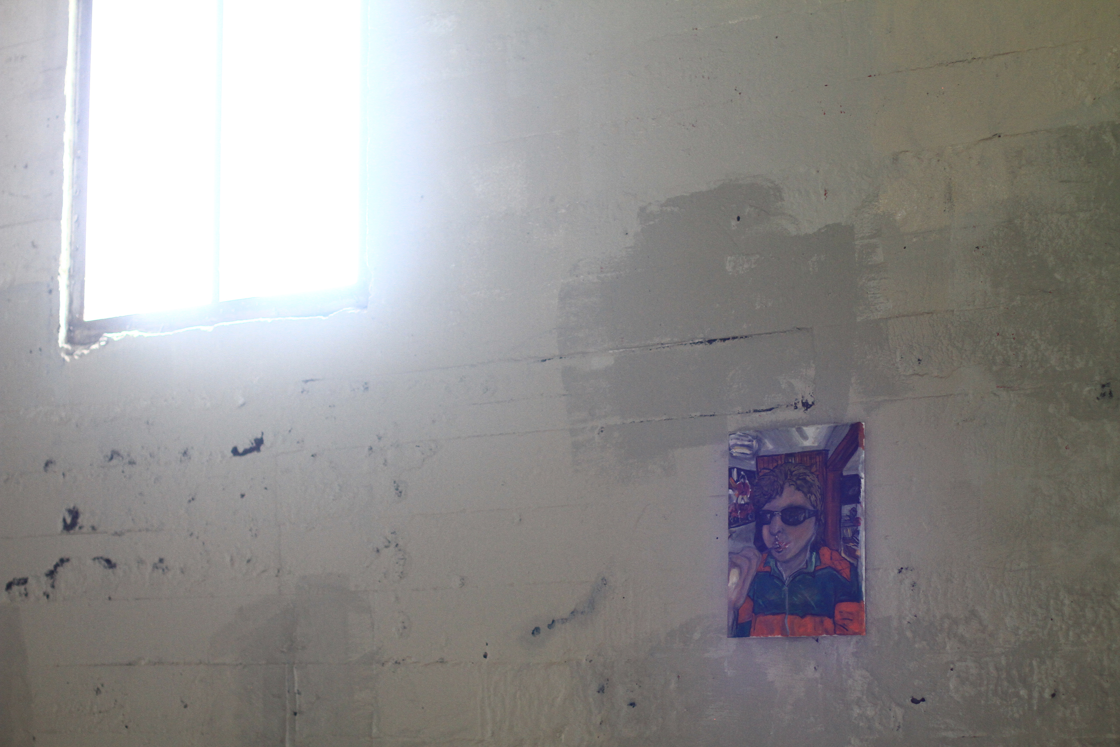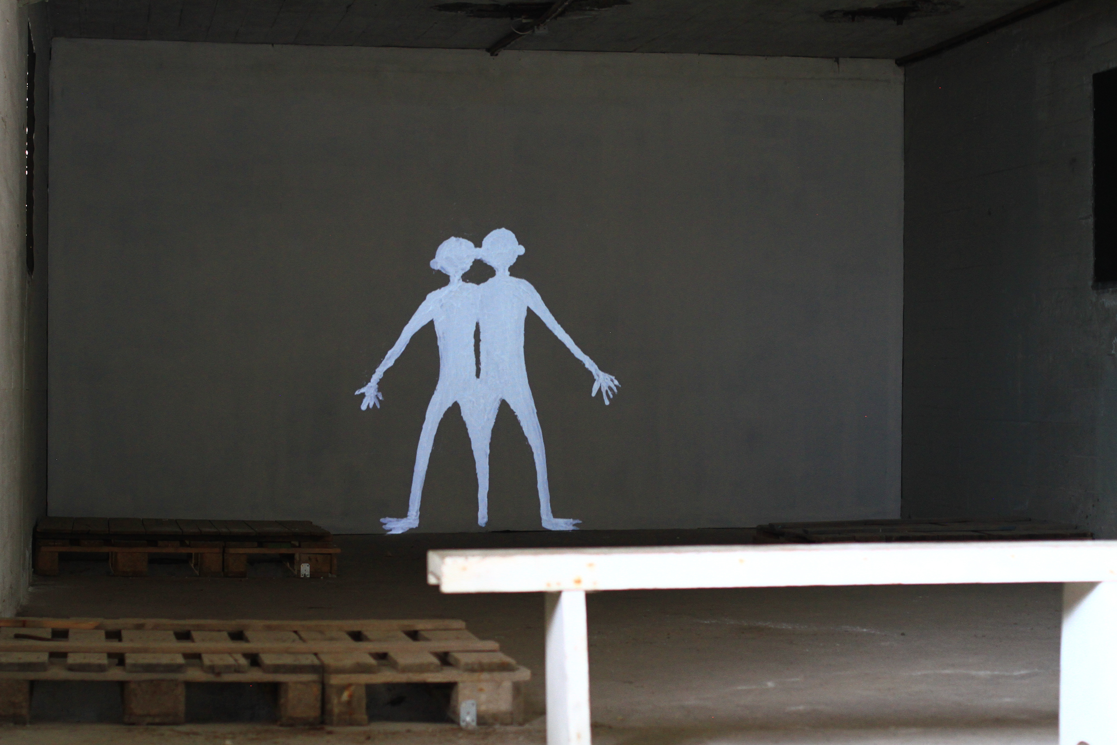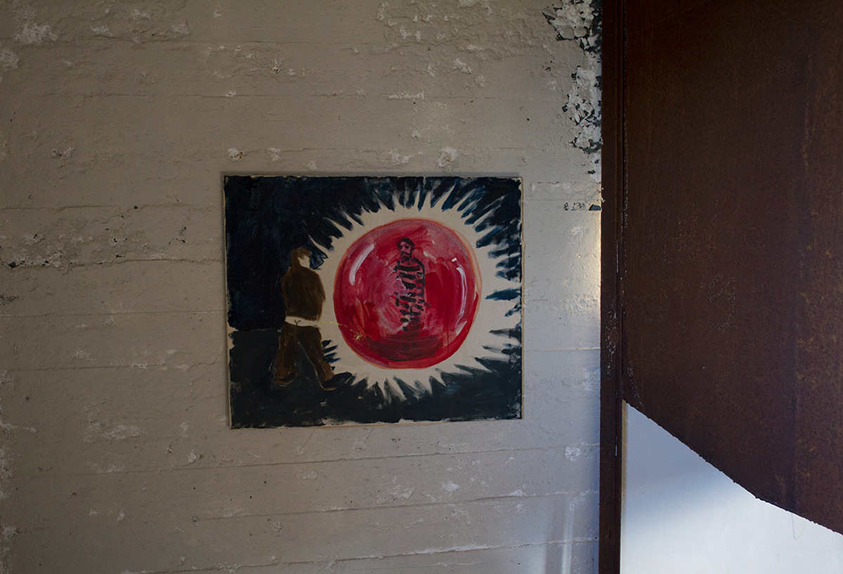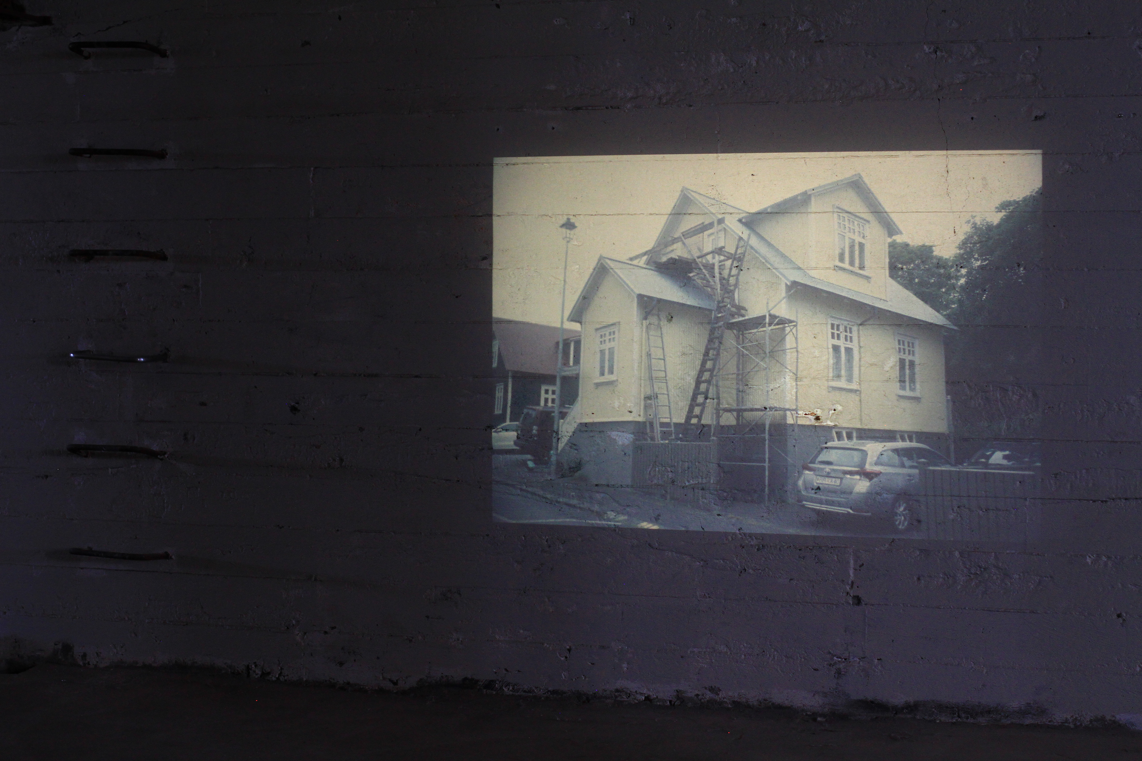 Axel goes on to tell me that the factory is supposedly haunted, and that when it was being built, one of the workers died while working their shift. Urban legend has it that the worker haunts the gallery in the form of detached rubber boots, wandering the space at night. Sometimes you can hear the boots squeaking, other times you see wet boot-prints on the concrete floors. Axel’s interest in the supernatural is a connecting theme in his work, and last month he visited Viðey to shoot a video outside the home of modernist poet Steinn Steinarr. Story has it that Steinn suffered from insomnia due to a ghost haunting him. A priest was called in and an exorcism was performed. The malevolent spirit was bound to a chair in the corner of the home, with a line of chalk drawn around it so that the ghost couldn't cross it. After this, Steinn didn’t have any problems sleeping. For this show Axel recreated aspects of the story via his signature use of the anti-aesthetic. In his video, the ghost has a bag on his head, and he describes it as “kind of stupid”.